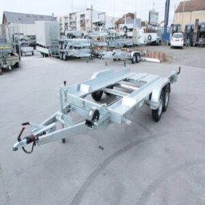 Plateau double essieux freiné de marque Euroremorque avec un PTAC de 2700 kg et une charge utile de 1650 kg (possibilité de déclassement à 2000 kg). Châssis galvanisé.